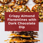 Almond Florentines are delicate, crisp cookies made from a caramelized mixture of vegan butter, brown sugar, golden syrup, nuts, and citrus peel, baked to a golden perfection and finished with a rich layer of dark chocolate on the bottom. These elegant treats combine crunchy almonds and pistachios with a subtle citrus tang, creating a perfect balance of sweet, nutty, and zesty flavors with a delightful chocolate coating.