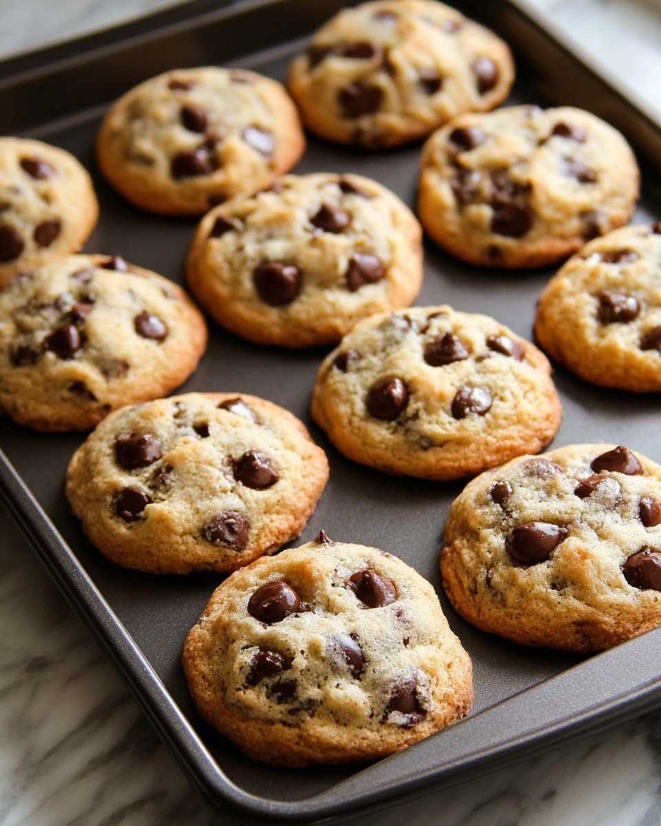 A tray with nine freshly baked chocolate chip cookies arranged loosely, each cookie having a golden brown base with a slightly crispy edge and a soft, chewy center, studded generously with glossy dark chocolate chips that are slightly melted. The cookies have a bumpy texture with small cracks showing the soft dough underneath, sitting on a dark baking tray placed on a white marbled surface. photo taken with an iphone --ar 4:5 --v 7