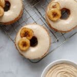10. Glaze the donuts: Dip each cooled donut into the brown butter glaze, allowing excess to drip off. Optionally, decorate with caramelized banana slices or enjoy the donuts as is.