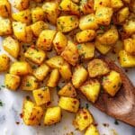 The image shows many small cubes of golden roasted potatoes spread on a white marbled surface, mixed with finely chopped green herbs. The potatoes have a crispy, slightly browned texture on the edges, with a soft inside, showing a mix of yellow and light brown colors. Some red chili flakes and black pepper are sprinkled on them, adding contrast to the yellow tones. Near the potatoes, a brown wooden spatula with a smooth texture is partially under some of the cubes, slightly lifting them. Light shines on the potatoes, making them look fresh and hot, with slight drops of oil visible on the surface. Photo taken with an iphone --ar 4:5 --v 7