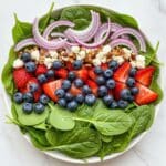 A fresh and vibrant Berry Spinach Salad combining nutrient-packed baby spinach with sweet strawberries, blueberries, raspberries, tangy feta cheese, and crunchy toasted pecans, all tossed in a homemade strawberry vinaigrette dressing. Perfect as a light lunch or a side dish for any meal.