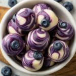 A white bowl filled with small round swirled treats that have two main colors: creamy white and deep purple, with the purple swirling around the white in a marble pattern. Each piece is smooth and shiny, with a single blueberry on top, adding a darker blue spot. The bowl sits on a white marbled surface with a few blueberries scattered around. The texture of the treats looks creamy and firm. photo taken with an iphone --ar 4:5 --v 7