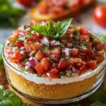 - Assemble the Dip: Spread the creamy cheese mixture evenly in a shallow serving dish. Then spoon the prepared bruschetta topping over the cheese layer. Garnish with chopped fresh basil, red pepper flakes (if using), and drizzle with balsamic glaze if desired. For the best flavor, chill the dip for at least 30 minutes before serving, then bring it to room temperature to enhance taste and texture.