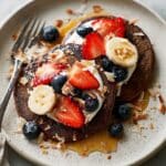 Two thick, dark brown pancakes sit side by side on a white plate with a light speckled pattern, placed on a white marbled surface. The pancakes' tops hold a layer of creamy white yogurt, bright red strawberry slices, deep blue blueberries, and round yellow banana slices. Golden-brown toasted coconut flakes are sprinkled over the fruit and pancakes. A pool of golden syrup flows from under the pancakes, spreading across the plate. A silver fork rests diagonally on the plate’s lower left side near the syrup. Photo taken with an iphone --ar 4:5 --v 7