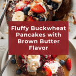 Deliciously nutty and fluffy buckwheat pancakes made with browned butter, cinnamon, and a touch of vanilla. These pancakes are perfect for a cozy breakfast or brunch, served warm with yogurt, fresh fruit, jam, toasted coconut, or maple syrup for added sweetness and flavor.