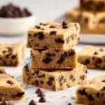 The image shows a stack of three thick, square chocolate chip cookie bars with a light brown color and dense texture, dotted with dark brown chocolate chips throughout each layer. Around the stack, there are additional pieces of cookie bars lying on a white marbled surface, with a few loose chocolate chips scattered nearby. The background includes blurred stacks of cookie bars and a white bowl filled with chocolate chips, enhancing the cozy and rich feel of the scene. photo taken with an iphone --ar 4:5 --v 7