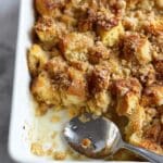 4. Assemble and bake: Sprinkle the streusel evenly over the soaked bread mixture in the baking pan. Bake in the preheated oven for 45 to 55 minutes, or until the top is golden brown and the casserole is set.