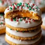 A stack of four round cookies is shown on a white marbled surface, each cookie with a golden-brown color and scalloped edges. Each cookie is topped with a smooth white icing that slightly drips over the edges. The top cookie is partially bitten, revealing a thick layer of shiny orange jelly inside. The icing on each cookie is decorated with small round sprinkles in red, green, and white colors, scattered generously. Photo taken with an iphone --ar 4:5 --v 7