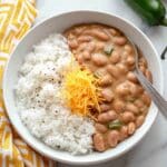 - Serve: Taste and adjust seasoning as needed. Serve the cheesy pinto beans hot over rice or alongside your favorite meal for a comforting and tasty addition.