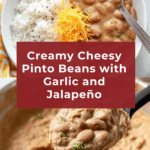 Keywords: cheesy pinto beans, pinto beans recipe, cheesy beans, Mexican side dish, vegetarian beans, easy bean recipe, quick side dish
