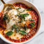 A delicious and comforting Chicken Parm Cottage Cheese Bowl that combines tender cooked chicken simmered in marinara sauce with creamy cottage cheese and melted mozzarella and Parmesan cheeses. Topped with Italian seasoning and fresh basil, this easy recipe is perfect for a quick, protein-packed meal.