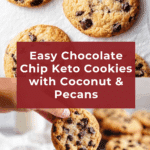 Delicious and easy-to-make Chocolate Chip Keto Cookies that are perfect for a low-carb lifestyle. These cookies blend melted coconut oil and butter with keto-friendly sweetener, sugar-free chocolate chips, coconut flakes, and roasted pecans for a delightful treat that’s both satisfying and keto-compliant.