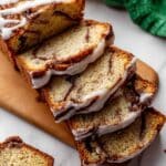 Store the banana bread covered at room temperature for up to 2 days or refrigerate for up to 1 week. The cinnamon sugar topping and glaze may seep into the bread and make the slices a bit moist on top over time. Reheat slices gently in a toaster oven or microwave before serving to refresh texture.