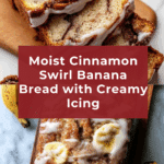 This Cinnamon Swirl Banana Bread is a moist and delicious treat with a perfect balance of sweet banana flavor and warm cinnamon spice. Featuring a cinnamon sugar swirl through the center and a rich vanilla cinnamon glaze on top, it’s a comforting homemade bread perfect for breakfast, snacks, or dessert.