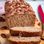 A loaf of soft, brown bread with a moist, textured inside and a golden-brown crust is topped with chopped pecans, giving a slightly crunchy look. Two slices are cut and laid in front, showing the inside texture, while some whole pecans are scattered around on a wooden board. The background has a white marbled texture visible at the edges. A knife with a red handle lies to the right. Photo taken with an iphone --ar 4:5 --v 7