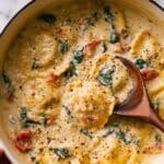 This creamy Tuscan ravioli soup is a comforting and flavorful dish featuring Italian sausage, cheese ravioli, sun-dried tomatoes, spinach, and Parmesan cheese in a rich, creamy broth with Italian herbs and spices. Perfect for an easy weeknight dinner that’s hearty and satisfying.
