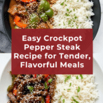 Keywords: Crockpot pepper steak, slow cooker pepper steak, easy pepper steak, beef and bell pepper recipe, slow cooked beef dinner