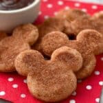 Several Mickey-shaped cookies with a rough, cinnamon-sugar coating sit stacked on each other placed on a white plate over a red napkin with white polka dots. To the left of the cookies is a white bowl filled with smooth, dark brown chocolate sauce, all set on a white marbled surface. photo taken with an iphone --ar 4:5 --v 7