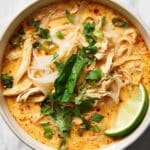 - Serve: Ladle the soup into bowls and serve immediately with lime wedges on the side for extra brightness. Note that the noodles will continue to absorb liquid over time, so add additional chicken broth when reheating leftovers if needed.