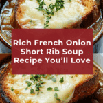 This French Onion Short Rib Soup combines tender, slow-braised beef short ribs with deeply caramelized onions, rich beef broth, and a touch of red wine for a flavorful, comforting meal. Topped with melted Gruyère cheese and served with toasted French baguette slices, this soup is a hearty twist on the classic French onion soup perfect for cozy dinners.