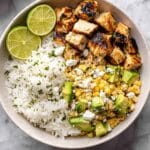 Delicious and vibrant Honey Chipotle Chicken Rice Bowls featuring tender marinated chicken grilled to perfection, topped with a fresh avocado corn salsa, crumbled queso fresco, and zesty lime garnishes. Perfect for a flavorful and satisfying meal that combines smoky, sweet, and spicy flavors.