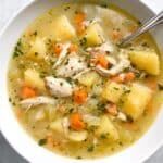 A white bowl filled with thick chicken soup showing large chunks of yellow potatoes and shredded pieces of cooked white chicken meat. The soup has small diced orange carrots and pale celery pieces scattered throughout in a light golden broth, topped with green herb sprigs. A silver spoon rests inside the bowl against the side. The bowl is placed on a white marbled surface. photo taken with an iphone --ar 4:5 --v 7