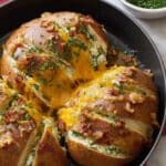 Jalapeno Popper Pull-Apart Bread is a deliciously cheesy and spicy appetizer featuring soft rolls filled with a creamy mixture of cream cheese, jalapenos, bacon, and shredded cheeses. The rolls are buttered, stuffed between the wedges, and baked until golden and bubbly, making it perfect for sharing at parties or as a tasty snack.