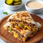 Keywords: Blackstone grilled quesadilla burger, cheesy quesadilla, ground beef quesadilla, grilled quesadilla recipe, Blackstone grill recipes