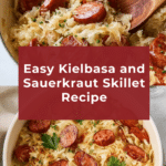 A hearty and flavorful Kielbasa and Sauerkraut skillet dish, combining smoky sliced kielbasa with tangy sauerkraut and aromatic seasonings, simmered to perfection. Perfect for a comforting meal that’s quick and easy to prepare on the stovetop.