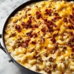 Keywords: Loaded Cheeseburger Alfredo Pasta, cheeseburger pasta, creamy pasta with beef, bacon pasta, penne Alfredo recipe