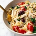 This Mediterranean Chicken Orzo is a flavorful and comforting one-pot dish combining tender shredded chicken, sweet grape tomatoes, briny olives and capers, fresh baby spinach, and creamy feta cheese, all cooked with orzo pasta in a savory chicken broth with white wine and Mediterranean herbs.