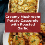 Keywords: mushroom casserole, potato casserole, vegan casserole, baked vegetable stew, roasted garlic recipe, hearty plant-based dish