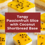 A delicious and tangy passionfruit slice featuring a buttery coconut shortbread base topped with a creamy passionfruit filling and a glossy passionfruit jelly topping. Perfect for a refreshing dessert or afternoon treat.