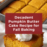 A decadent Pumpkin Butter Cake featuring a buttery yellow cake base layered with a rich, creamy pumpkin and cream cheese filling, infused with warm pumpkin pie spices. Perfect for autumn gatherings and holiday desserts, this cake offers a smooth texture with a delightful balance of sweetness and spice.