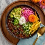 - Serve. Ladle the chili into bowls and garnish with preferred toppings such as sour cream, diced avocado, sliced scallions, pickled red onions, cilantro, and crispy tortilla strips.