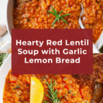 Keywords: red lentil soup, vegetarian soup, healthy lentil recipe, Mediterranean soup, garlic bread, easy lentil soup