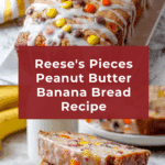 Keywords: peanut butter banana bread, Reese’s Pieces, peanut butter glaze, banana bread recipe, easy dessert, sweet bread