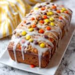 Keywords: peanut butter banana bread, Reese’s Pieces, peanut butter glaze, banana bread recipe, easy dessert, sweet bread
