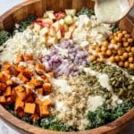 - Combine the salad: In a large bowl, add marinated kale, cooked sweet potatoes, cooked quinoa, diced apples, pumpkin seeds, feta cheese, red onion or shallot, and chickpeas if using.