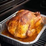- Chicken broth added to the pan helps maintain moisture during smoking.