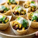 These vegetarian plantain and black bean taco cups are a fun and flavorful twist on traditional tacos. Crispy tortilla cups filled with a savory mixture of sautéed plantains, black beans, and melted manchego cheese make for a perfect appetizer or snack. Topped with fresh avocado and cilantro, they bring a vibrant taste to your table.